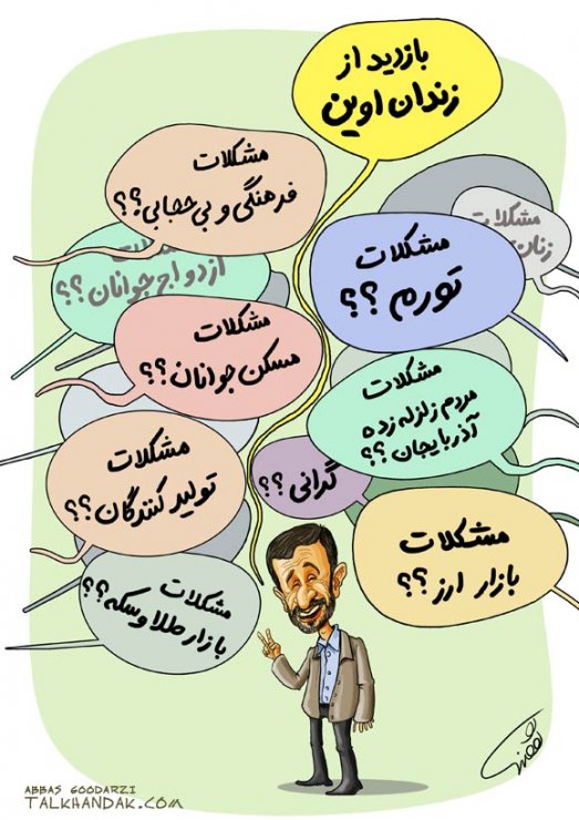 چند وقت پیش کاریکاتوری از جناب عالی دیدم که شاید بتوان آن را شرح حال امروز شما دانست! شما در پایین کاریکاتور بودید و در حالی که صداهای مختلفی از این طرف و آن طرف مسایل و مشکلات اصلی کشور را به شما گوشزد می کرد، شما درخواست بازدید از زندان اوین را مطرح می کردید!!
